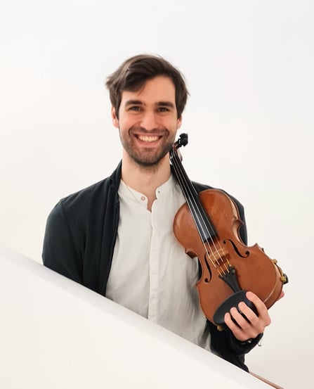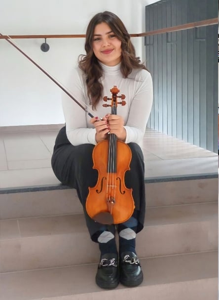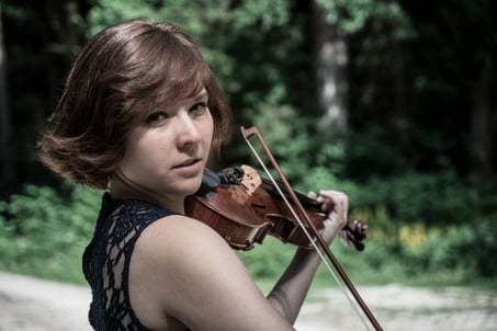 Die Violine, auch Geige genannt, ist das kleinste Instrument in der Familie der Streichinstrumente. Zum Spielen wird sie wie die Viola unter dem Kinn festgehalten. Die Töne werden wie bei allen Streichinstrumenten durch Zupfen oder mit einem Bogen erzeugt. Der Bogen ist mit Pferdeschweifhaar bespannt.